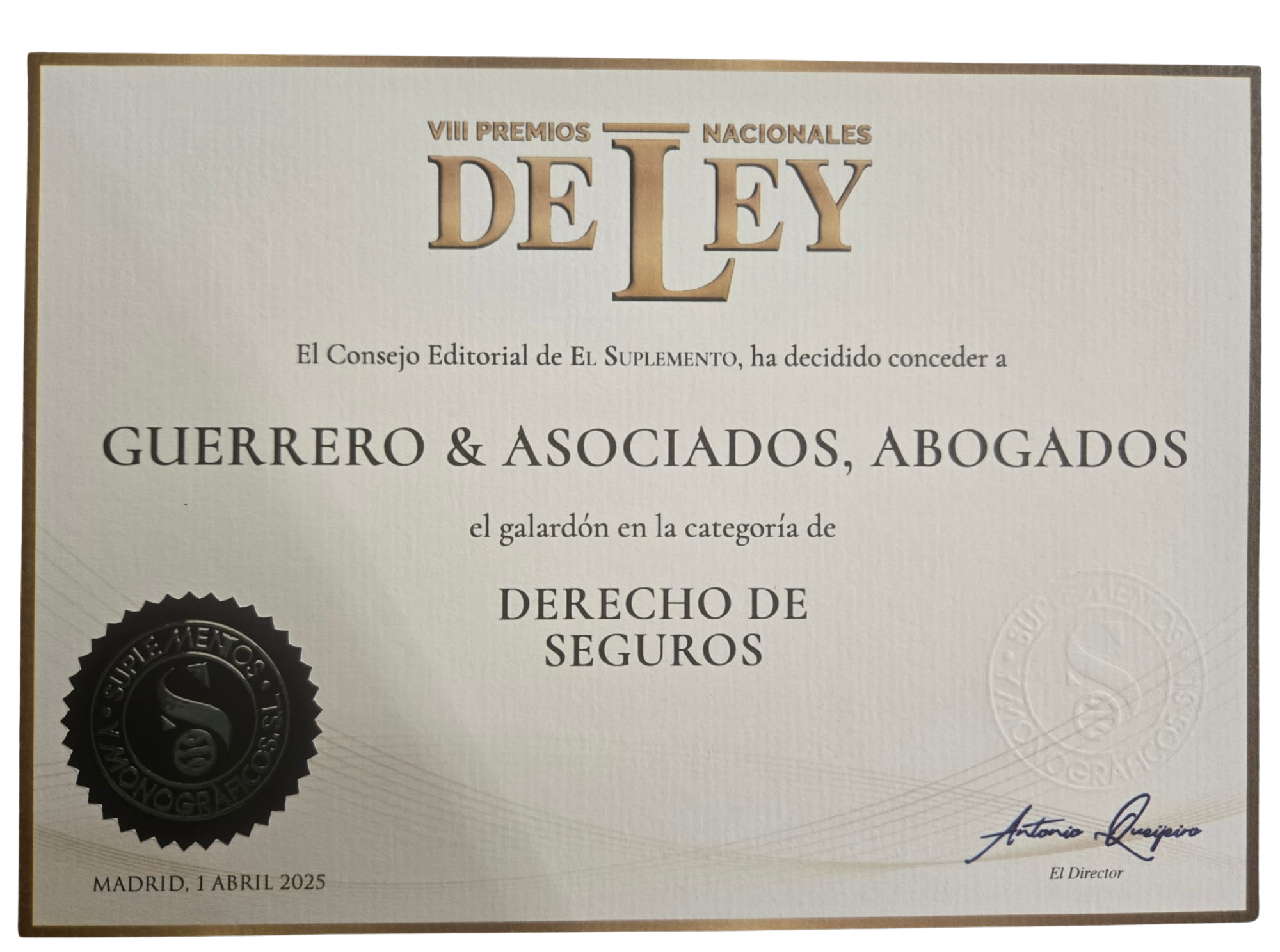Nos sentimos profundamente orgullosos de haber sido galardonados en la VIII Edición de los Premios Nacionales De Ley en la categoría de Derecho de Seguros, celebrada en el emblemático hotel Westin Palace de Madrid.
